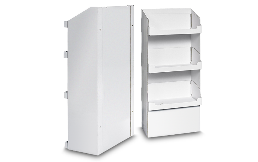 Displays bestehen generell aus einer großen Anzahl von Einzelteilen. Die Teile werden in Ihrer BAHMÜLLER Faltschachtelklebemaschine zunächst mit Heißkleber und Kaltleim zusammengefügt, um dann im regulären Prozess der FKM durchgefördert oder nochmals gefaltet zu werden. Hierfür wird wie beim Shelf Ready Packaging (SRP) das Modul TOPMATCHER angewandt. Zudem gewährleistet der Mehrfachanleger eine intelligente Umsetzung von Sonderlösungen zur Stabilitätssteigerung und Stoffoptimierung.